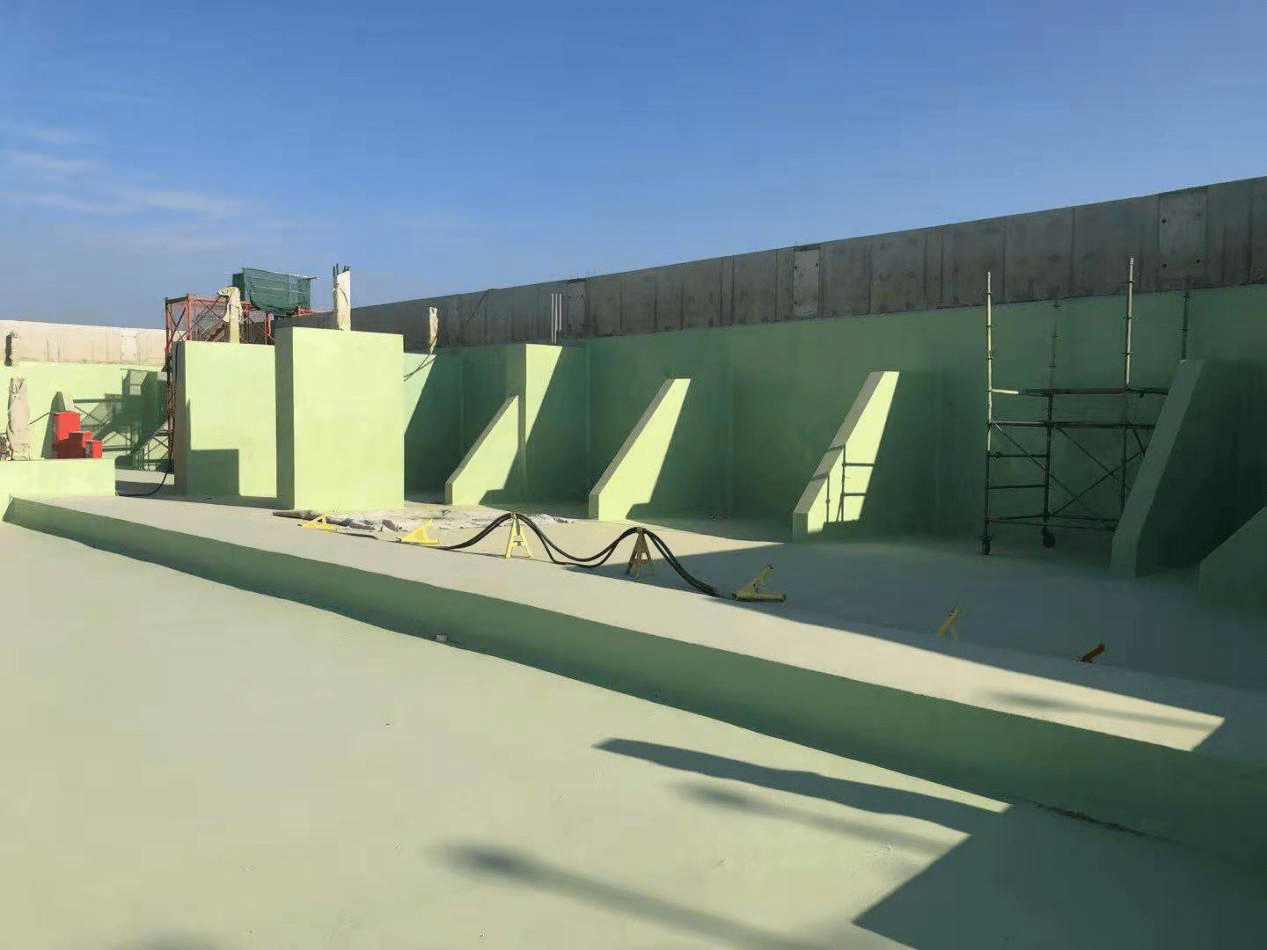 噴涂聚脲:是由異氰酸酯組份(簡稱A組份)與氨基化合物組份(簡稱R組份)反應生成的一種彈性體物質。異氰酸酯既可以是芳香族的,也可以是脂肪族的。其中的A組份可以是單體、聚合體、異氰酸酯的衍生物、預聚物和半預聚物。預聚物和半預聚物是由端氨基或者端羥基化合物與異氰酸酯反應制得。其中的R組份必須是由端氨基樹脂和端氨基擴鏈劑組成,在端氨基樹脂中,不得含有任何羥基成分和催化劑,但可以含有便于顏料分散的助劑。